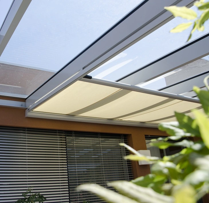 Store extérieur avec système de contre-tension, conçu principalement pour les jardins d'hiver et les grandes surfaces vitrées. Ce type de store peut également être installé verticalement.