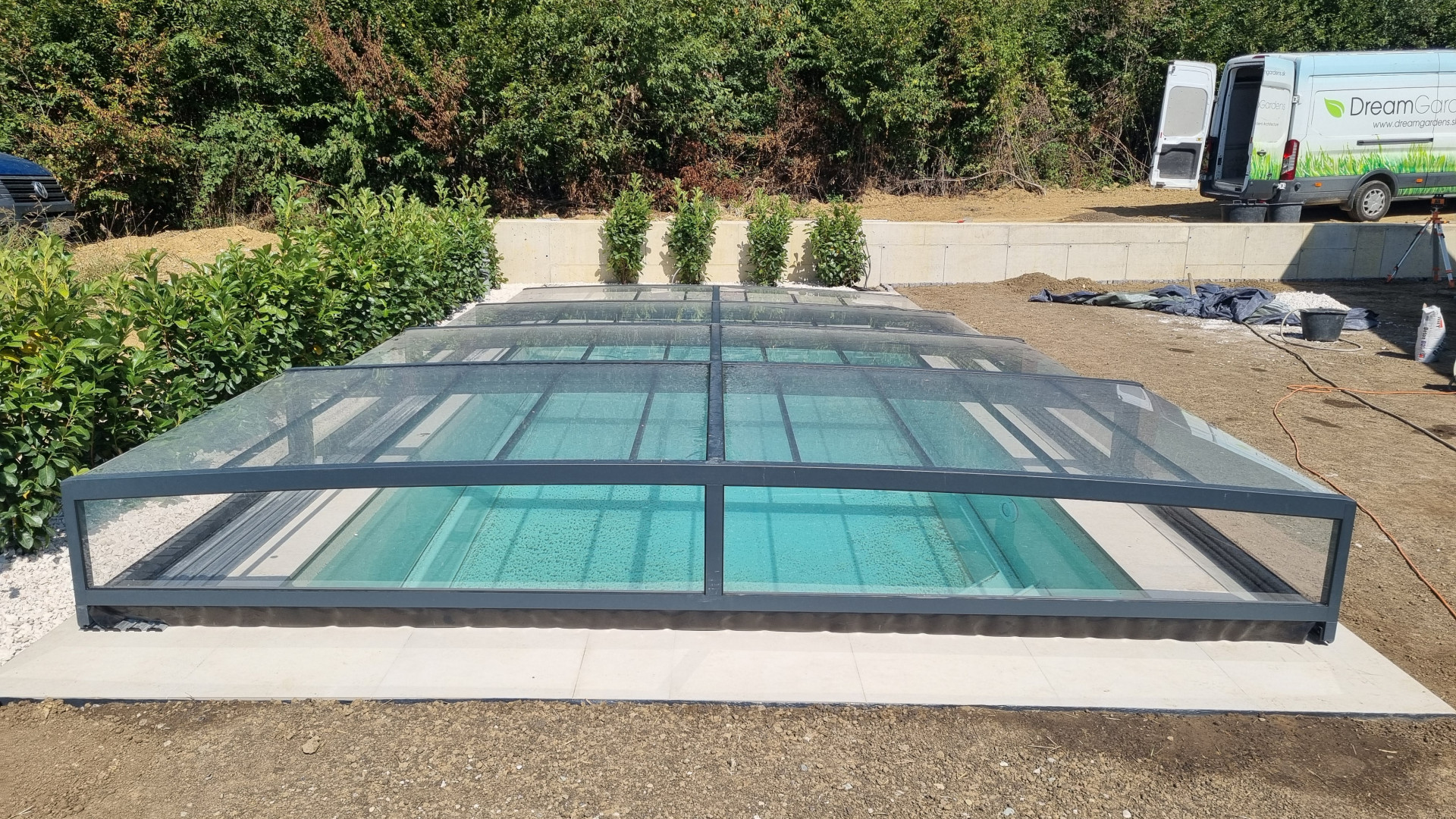 L'abri de piscine EXCLUSIVE est disponible avec une largeur intérieure allant de 3,0 m à 6,0 m. La hauteur du segment le plus bas commence à 200 mm, variant selon le nombre de segments et la largeur totale de l'abri.