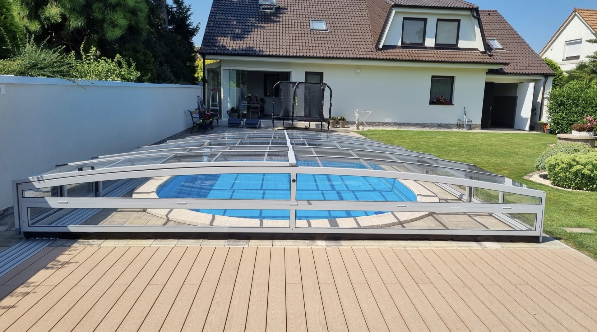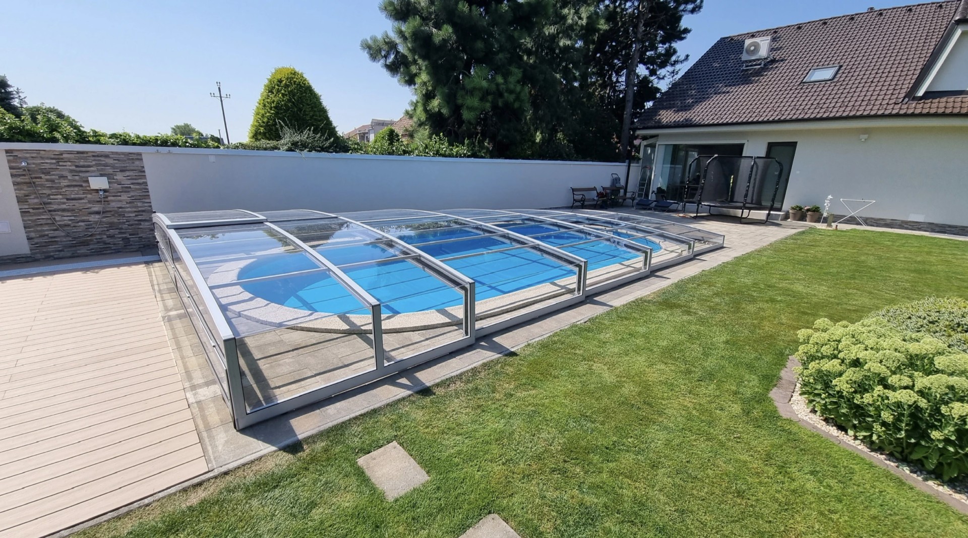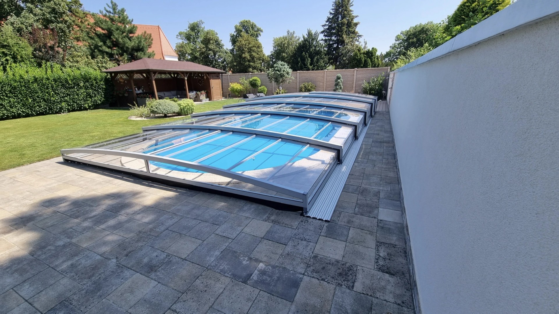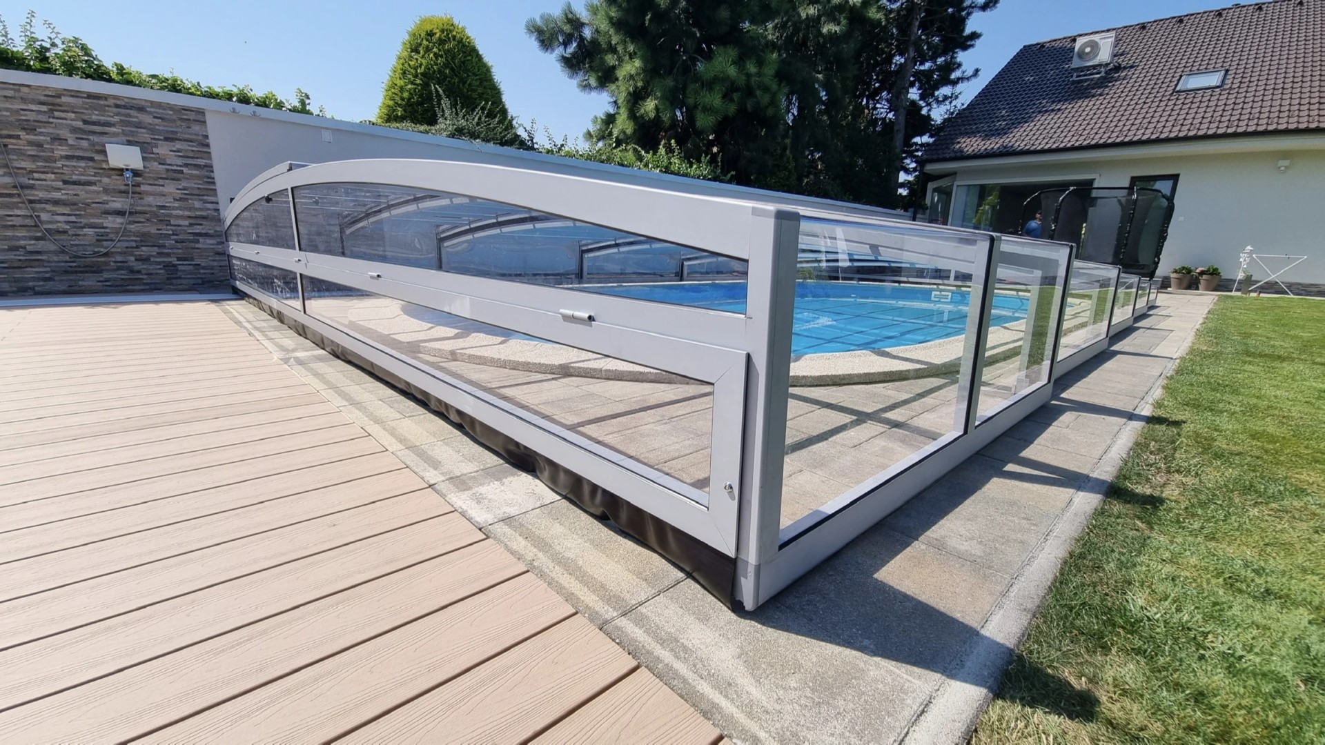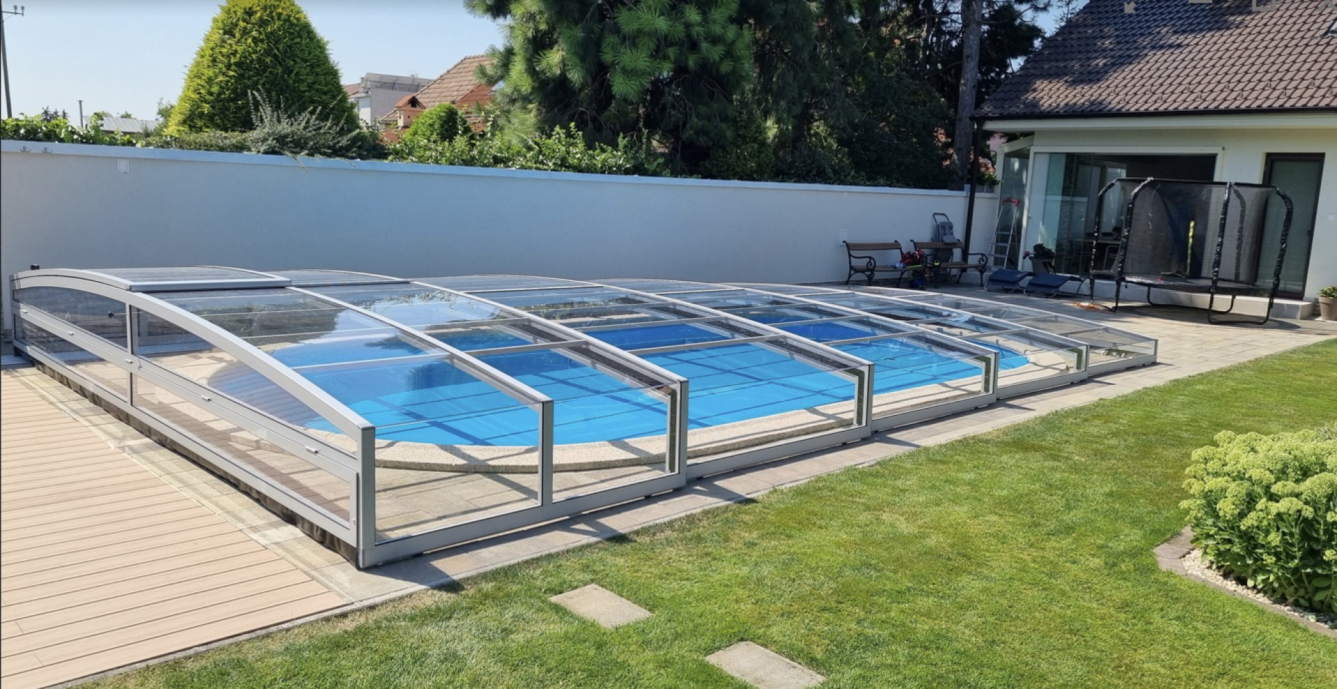 En choisissant l'abri PREMIER, le client a opté pour une solution esthétique au problème de pollution de l'eau par les feuilles et autres impuretés. Dans ce projet, la piscine est située dans un endroit ensoleillé et l'installation de l'abri permet de maintenir la température de l'eau sous la structure. Grâce à cette capacité, le client peut profiter d'une baignade nocturne agréable même à la fin ou après la saison estivale. Le client a mis l'accent sur la sécurité des jeunes enfants à proximité du bassin, renforcée par la conception à rail unique. Plus de crainte que les enfants ne trébuchent sur un rail ou ne tombent. De plus, ce système à rail unique offre un accès beaucoup plus confortable à la piscine.