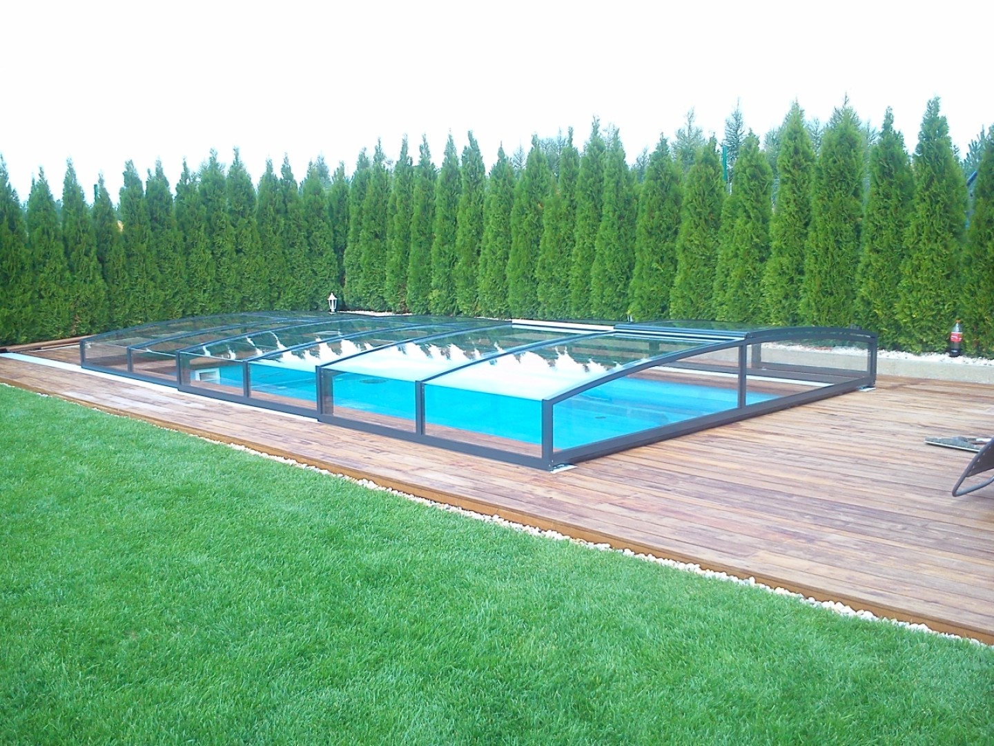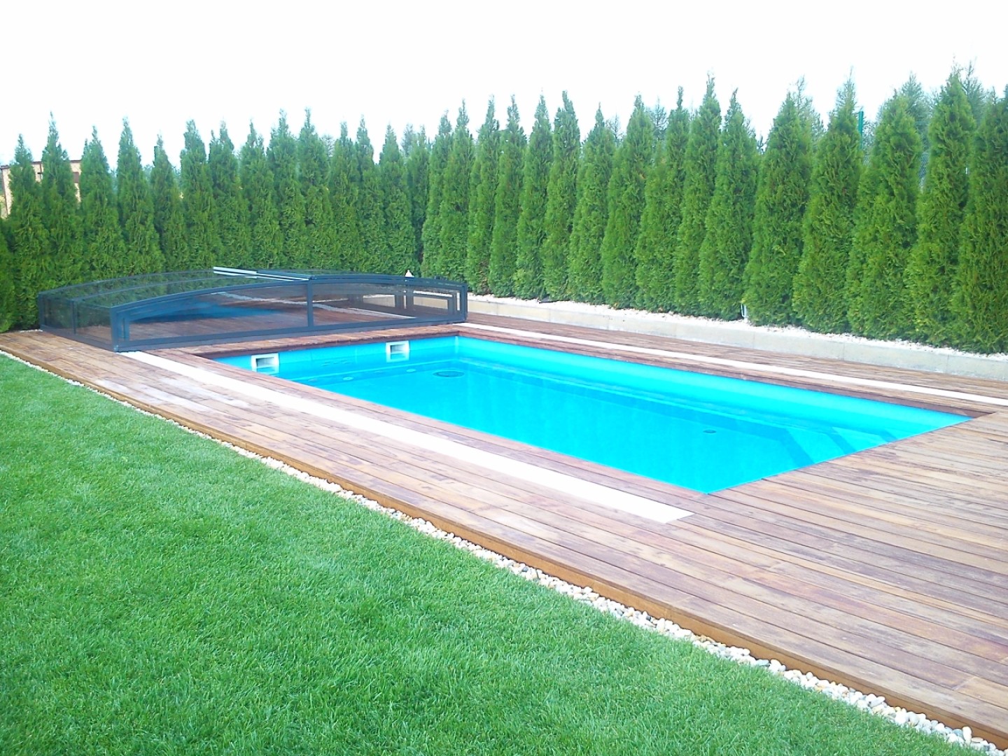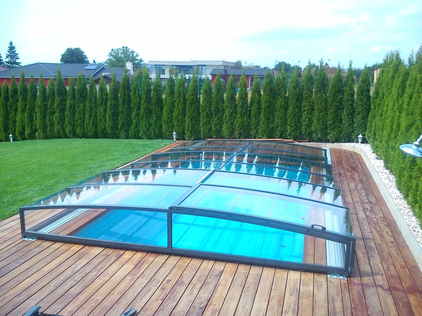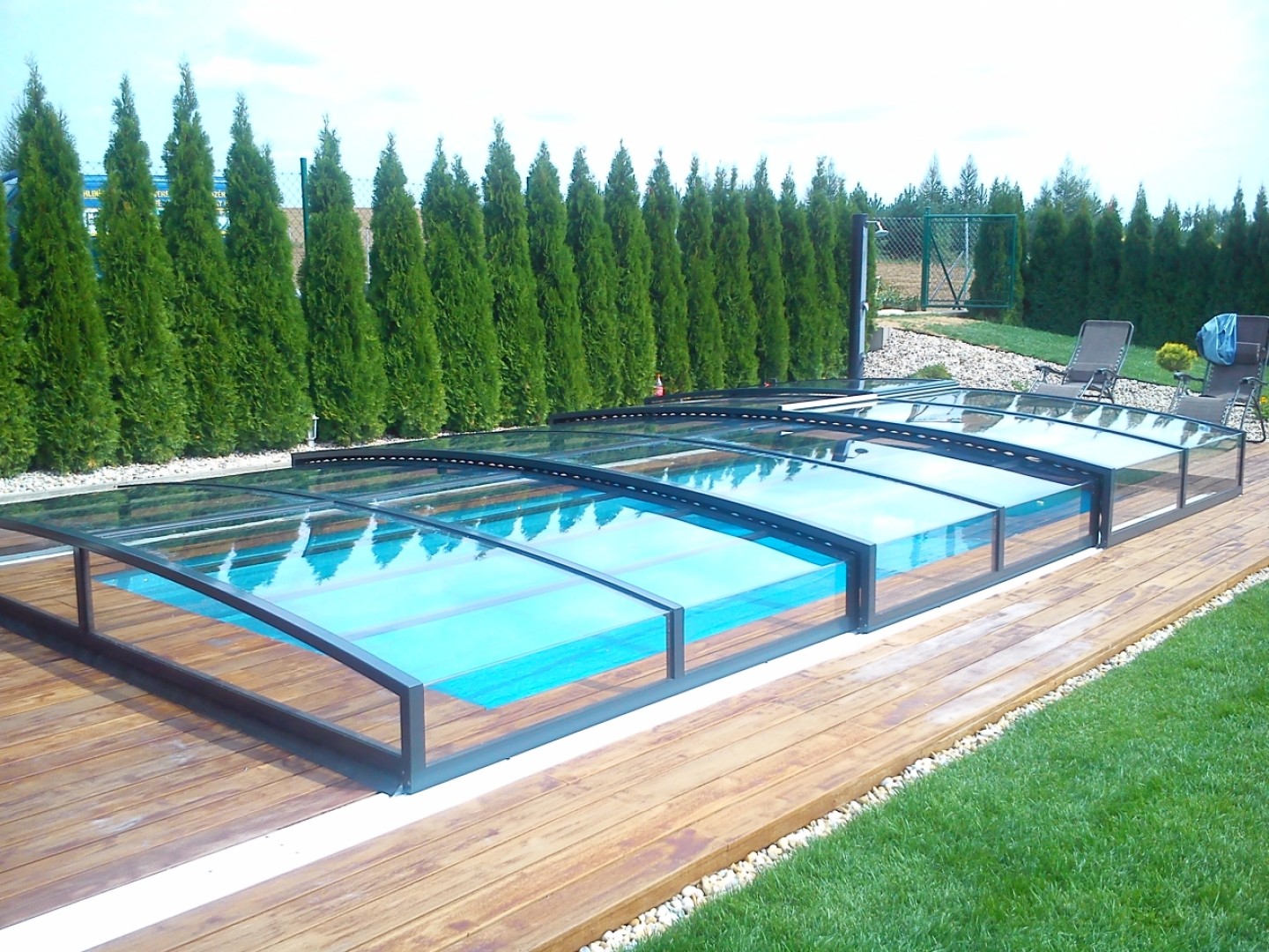 Lors du choix du modèle STAR, le client a mis l'accent sur son élégant design bas. Malgré sa structure surbaissée, il est tout à fait possible de nager sous l'abri. Sur ce modèle, les différents segments sont télescopiques et s'emboîtent les uns sous les autres, ce qui permet de gagner un espace précieux autour de la piscine.