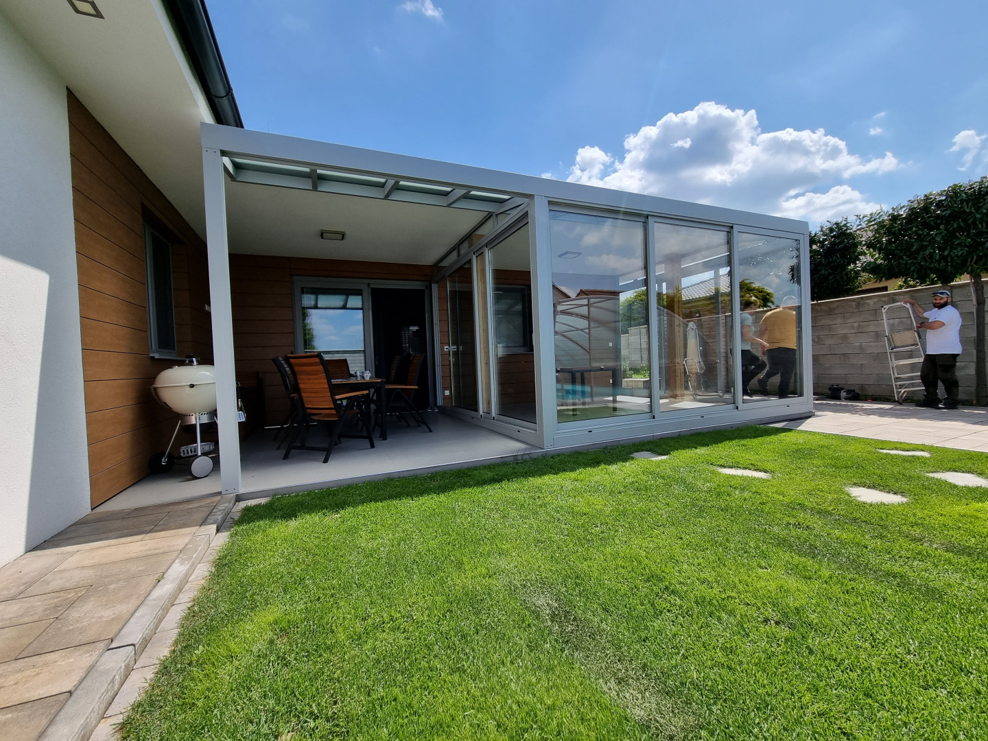 À Skalica, nous avons créé une véranda qui offre aux propriétaires davantage d'espace pour se détendre en toute saison. Les grandes parois vitrées laissent entrer généreusement la lumière et offrent une vue magnifique sur le jardin, tandis que la structure robuste en aluminium garantit une résistance optimale et une grande longévité.