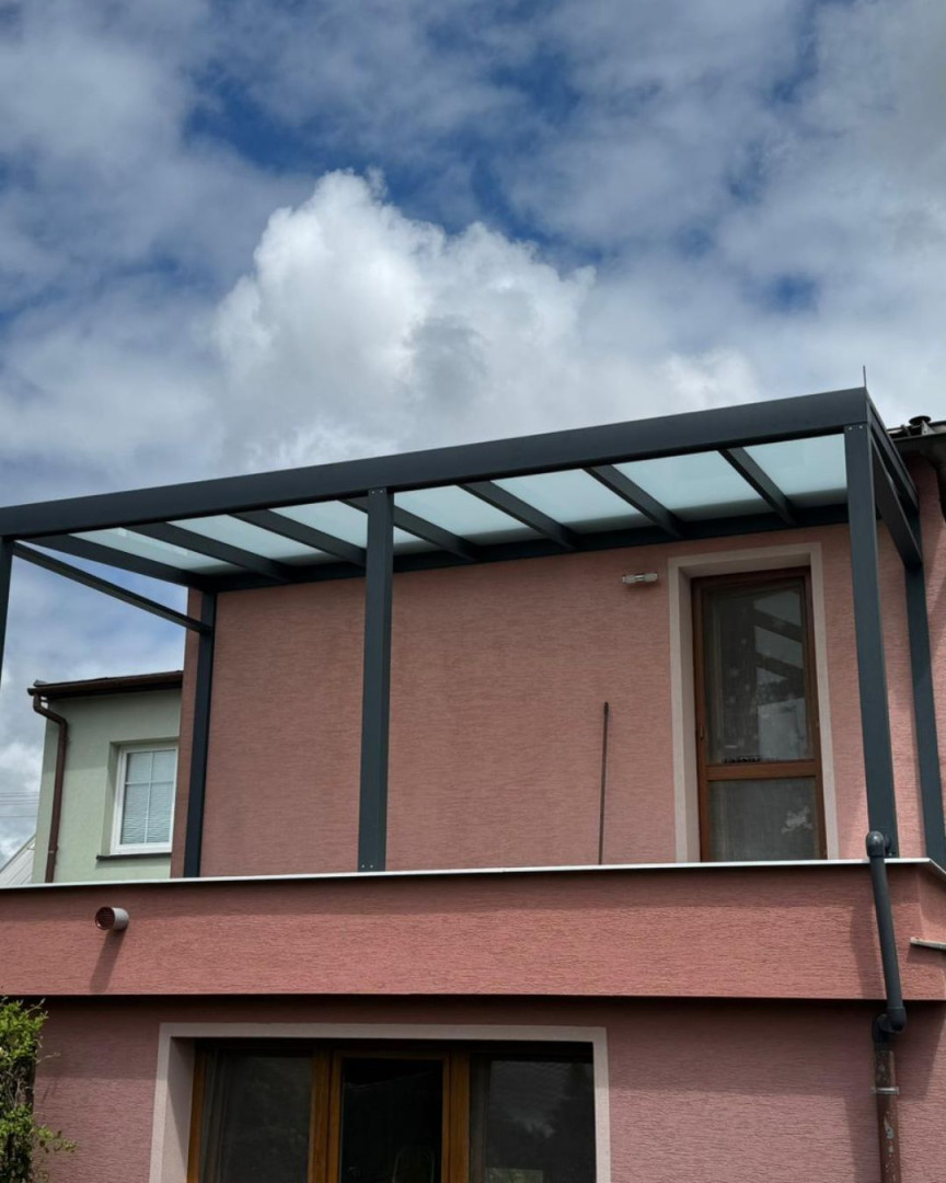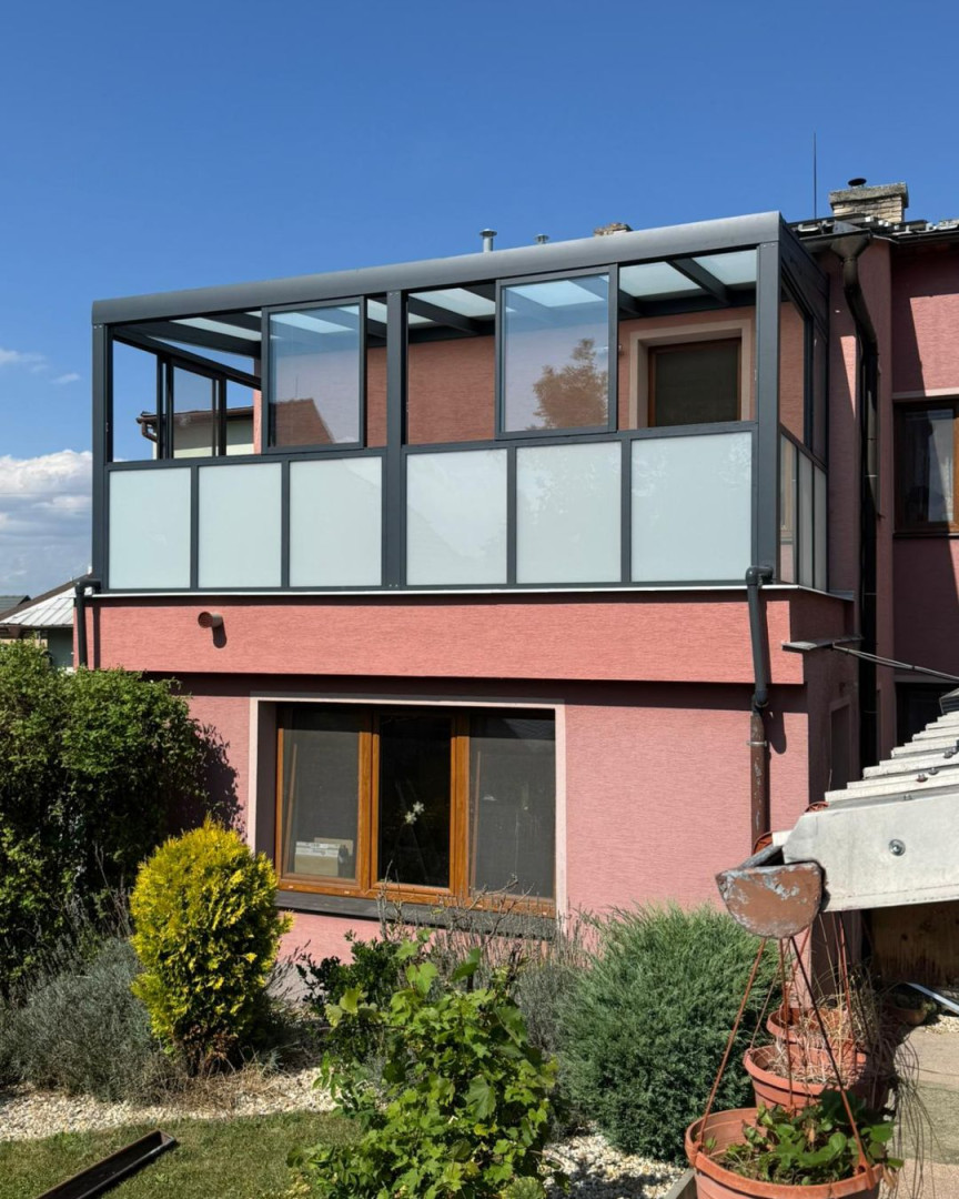 Cette pergola de type Robust s'est transformée au fil du temps en un espace de détente utilisable toute l'année. Dans une première phase, nous avons installé un abri fixe en aluminium avec du polycarbonate opale. Par la suite, nous avons ajouté un vitrage avec cadre, créant ainsi un abri parfait contre le vent tout en préservant la vue.