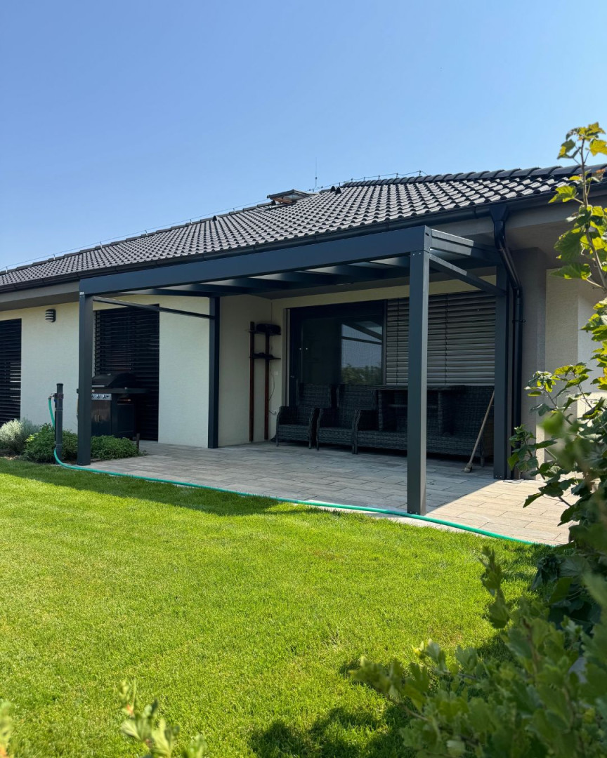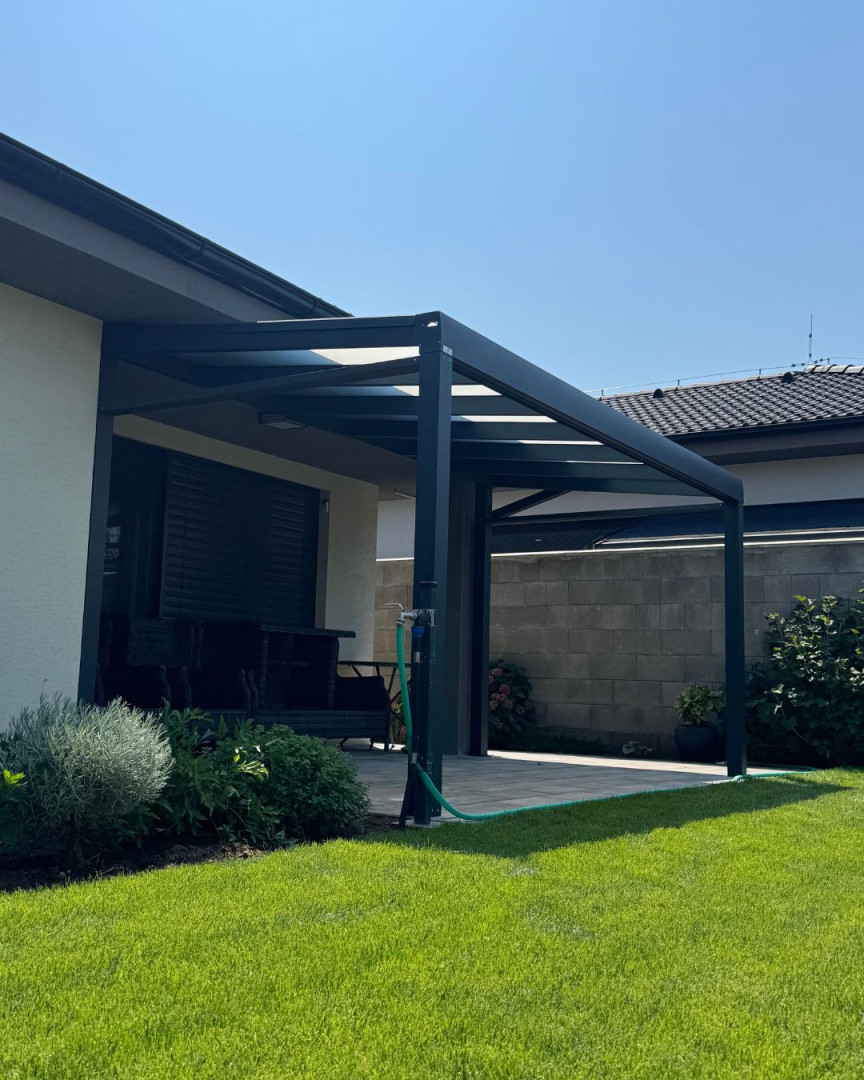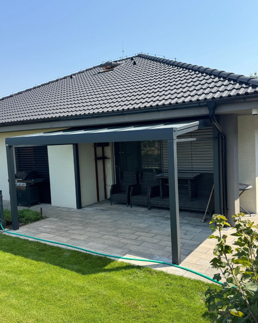 Cette réalisation montre comment la pergola en aluminium Robust s'intègre au quotidien comme une extension naturelle de votre espace de vie. Le vitrage isolant transparent laisse passer la lumière du jour tout en offrant une protection contre les aléas de la météo.