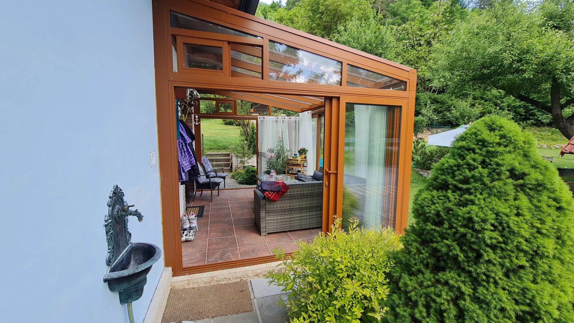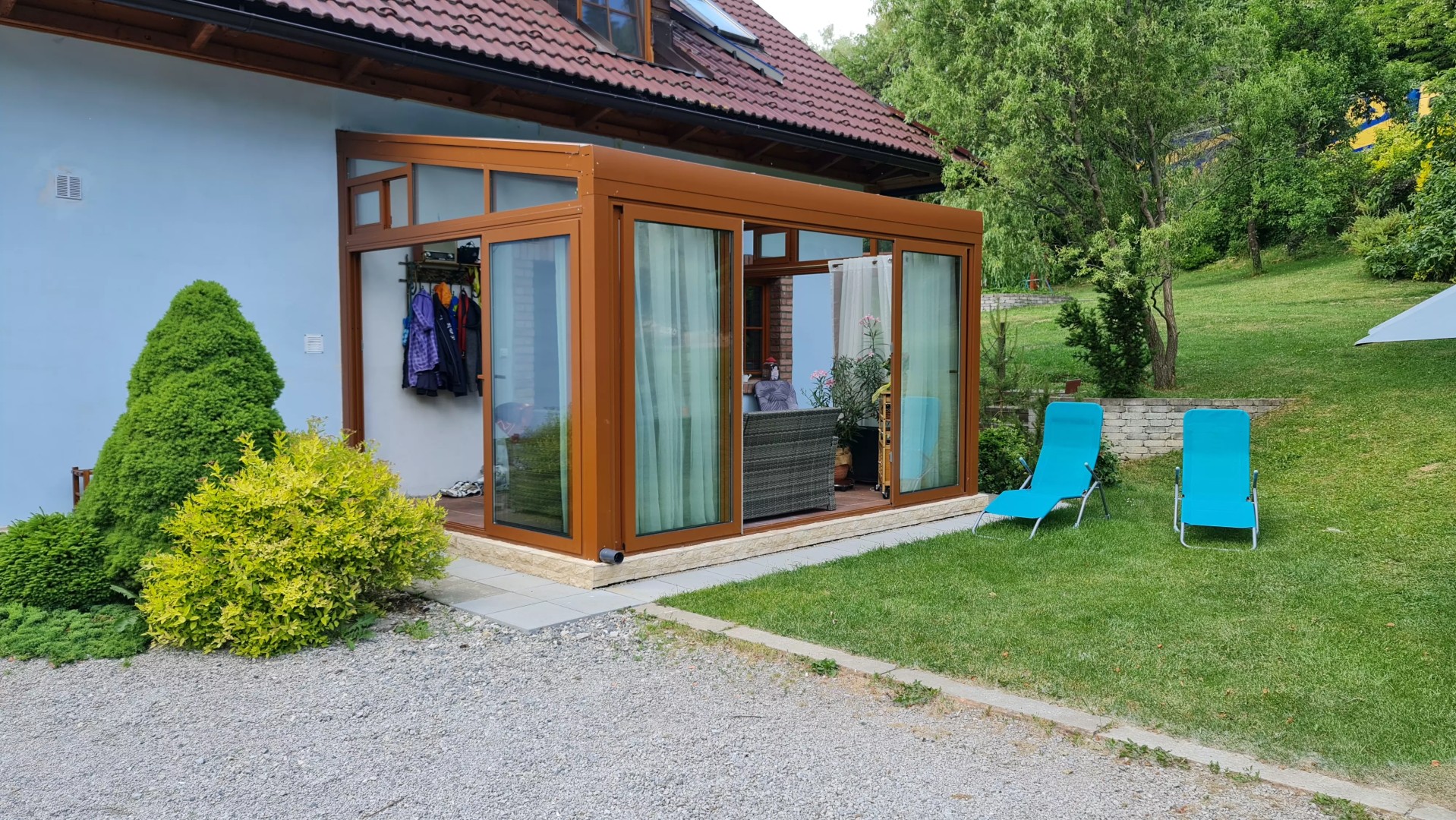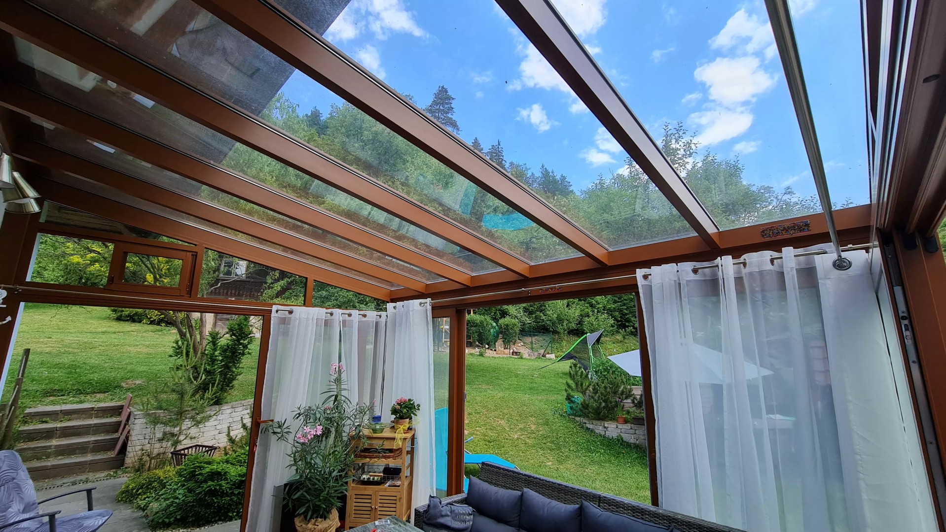 Pour chaque projet, nous nous efforçons d'aborder l'espace avec sensibilité. L'emplacement de la véranda détermine toute l'impression finale de la réalisation. La finition brune de la pergola ROBUST a apporté un visuel chaleureux et accueillant à cette véranda. Dans notre atelier de laquage à sable MontAlu, nous sommes en mesure de composer des couleurs sur mesure, ce qui nous permet de nous adapter à chaque client. Ce service est disponible en option (avec supplément).