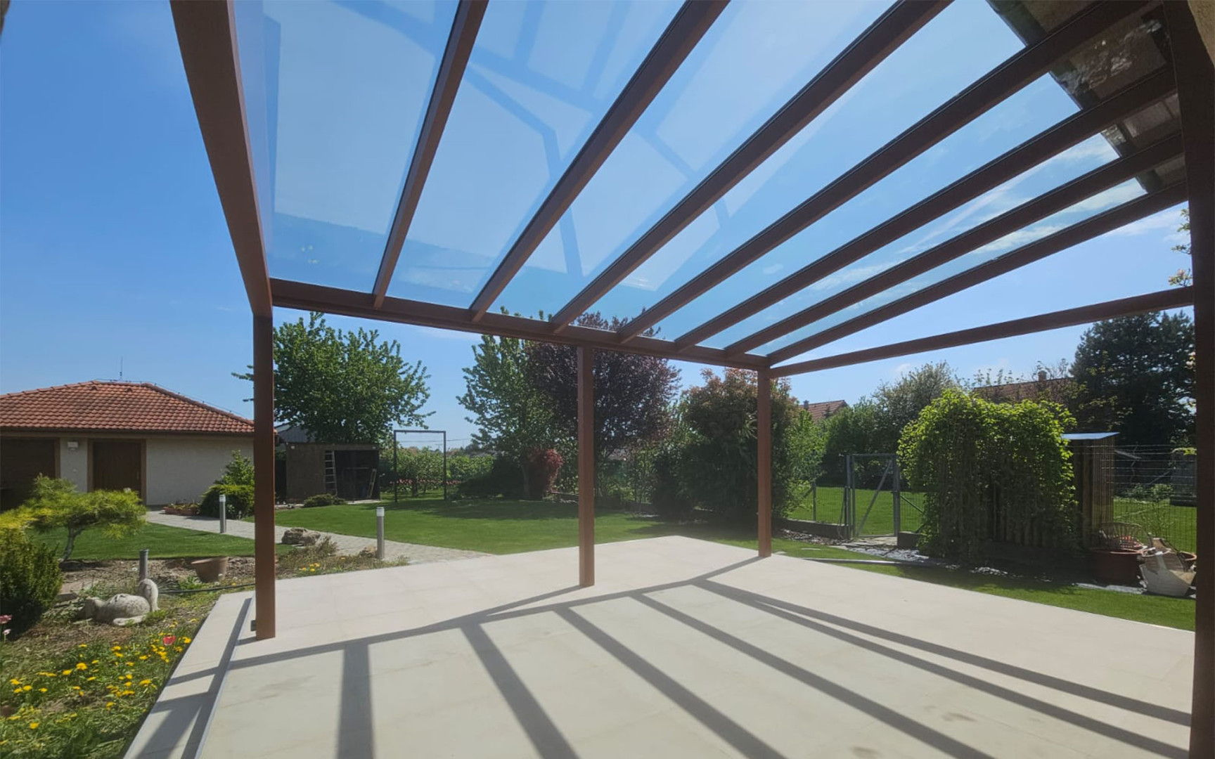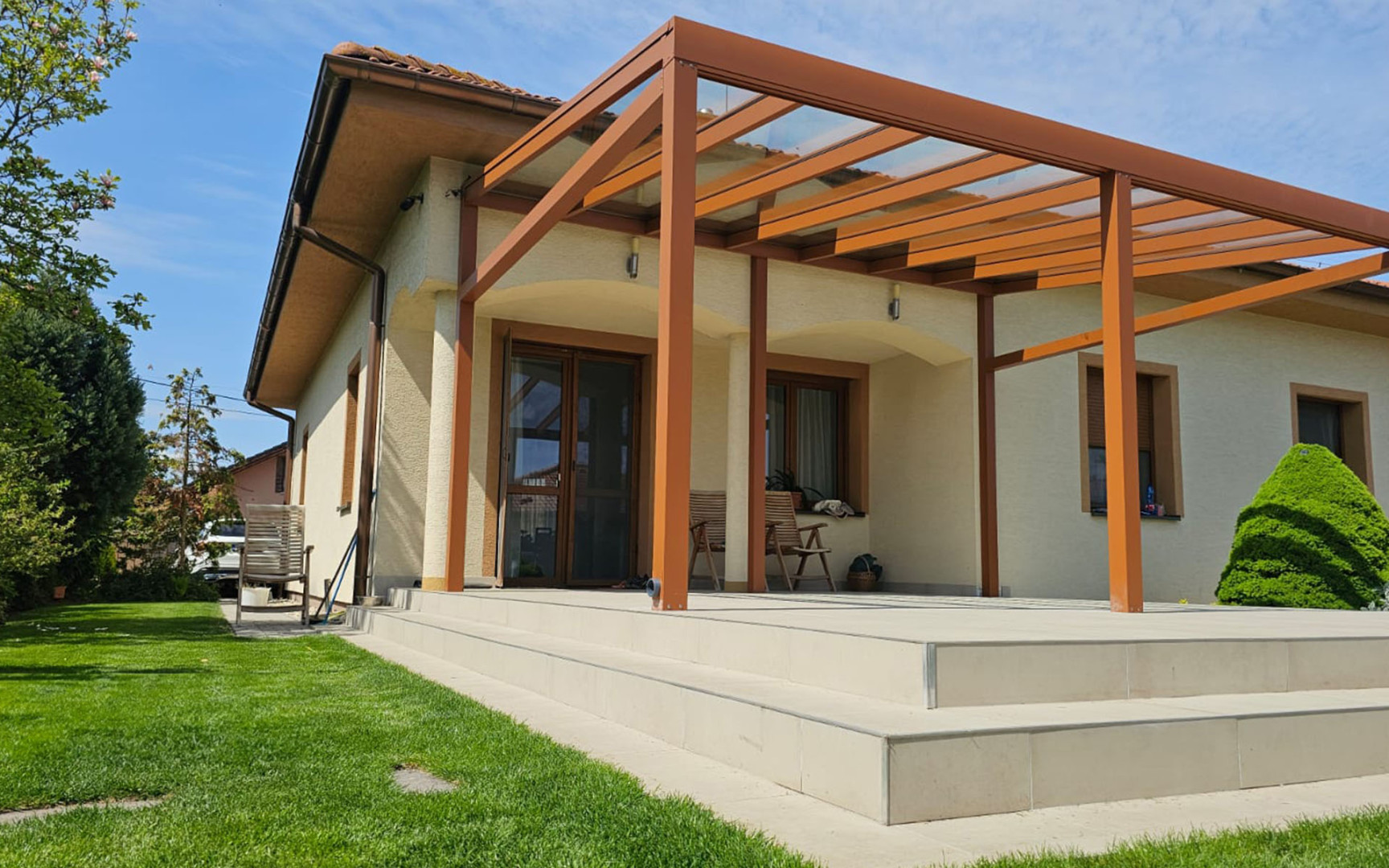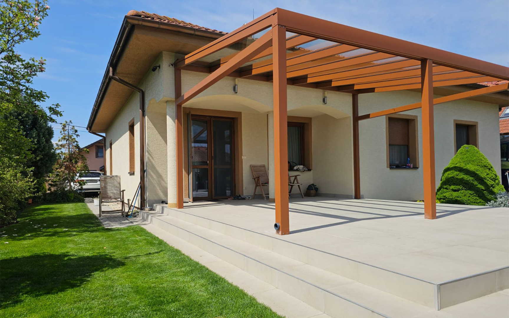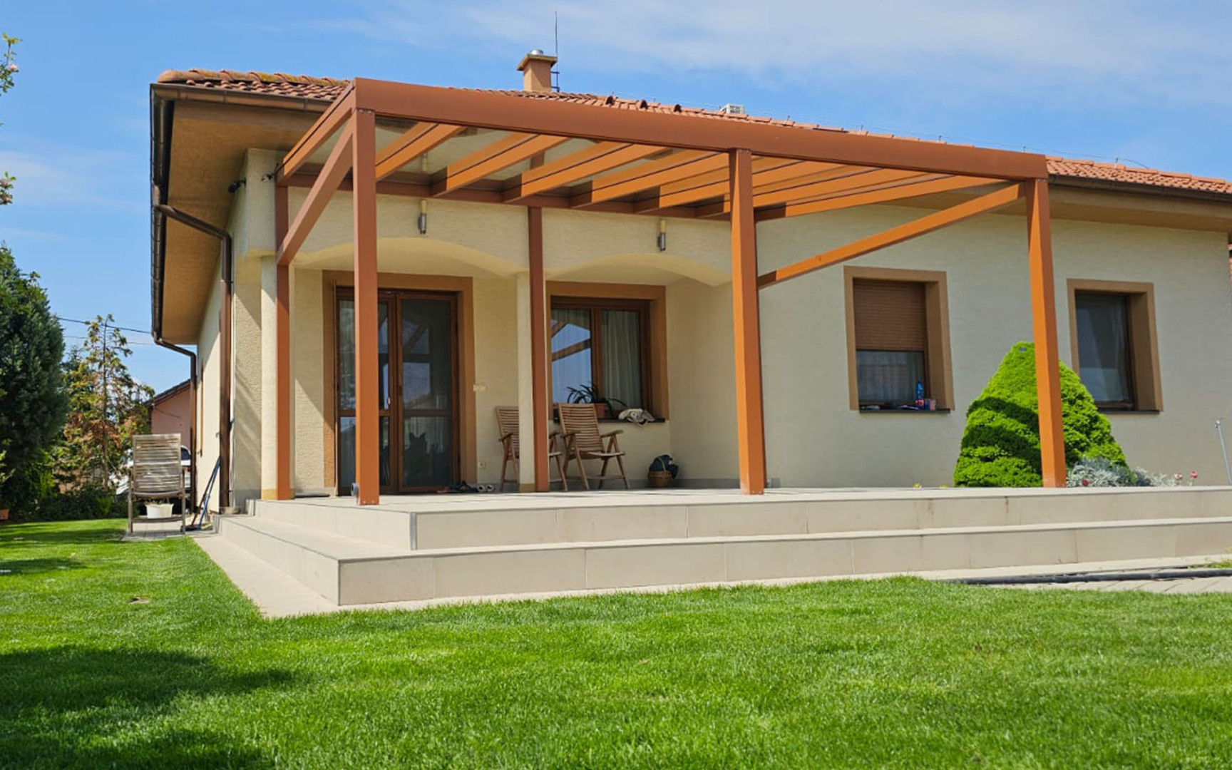 Une pergola en aluminium qui non seulement s'harmonise avec l'architecture de la maison, mais répond également à des exigences élevées en matière de résistance et de longévité sans entretien. La finition dans une teinte brun chaud donne une impression d'aspect rouillé au premier regard, mais il s'agit en réalité d'une solution élégante et pratique qui ne rouille pas, ne nécessite aucune peinture et résiste à toutes les intempéries.