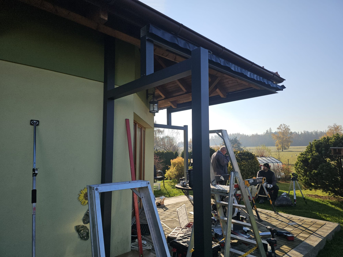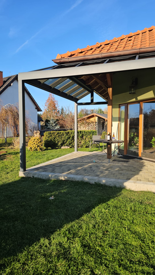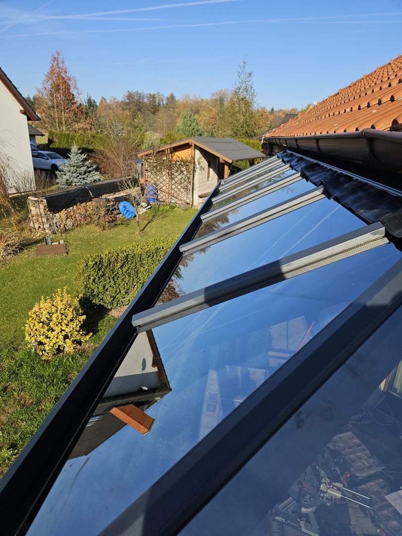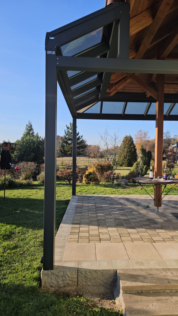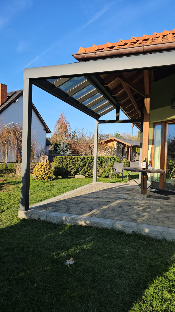 Dans la commune d'Ondřejov-Třemblat, nous avons réalisé une pergola en aluminium ROBUST avec un vitrage design Stopsol Grey et le système SLIDE, permettant un coulissement fluide du vitrage frontal. La pergola couvre une largeur totale de 8,4 mètres, offrant un ombrage agréable et une protection efficace contre le vent.