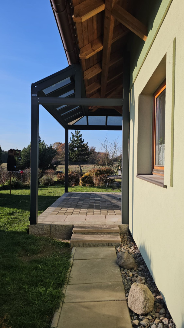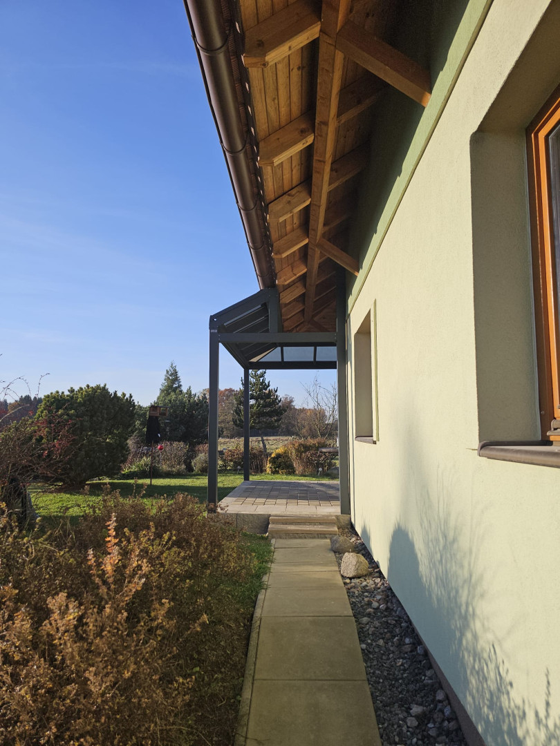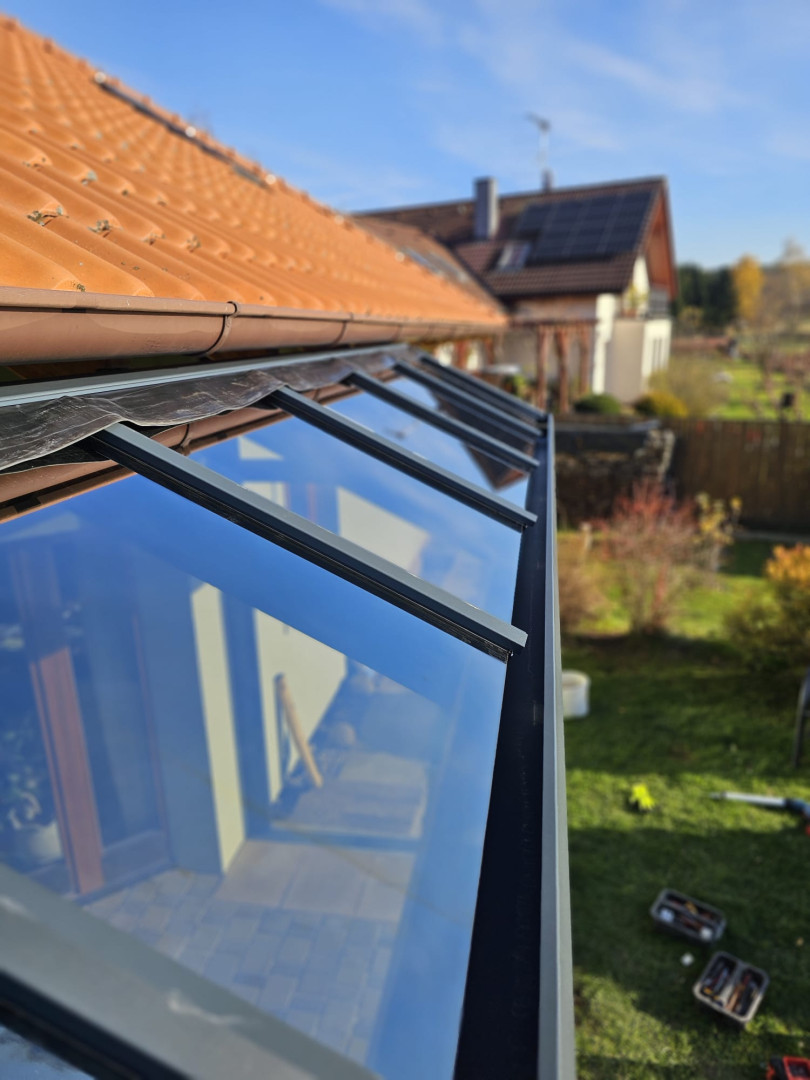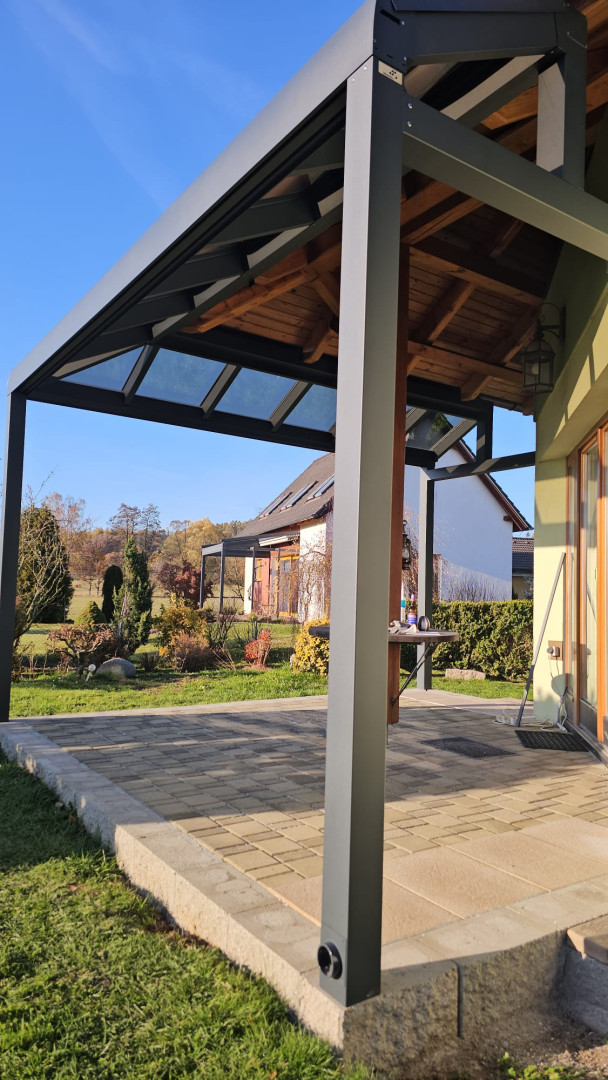 Dans la commune d'Ondřejov-Třemblat, nous avons réalisé une pergola en aluminium ROBUST avec un vitrage design Stopsol Grey et le système SLIDE, permettant un coulissement fluide du vitrage frontal. La pergola couvre une largeur totale de 8,4 mètres, offrant un ombrage agréable et une protection efficace contre le vent.