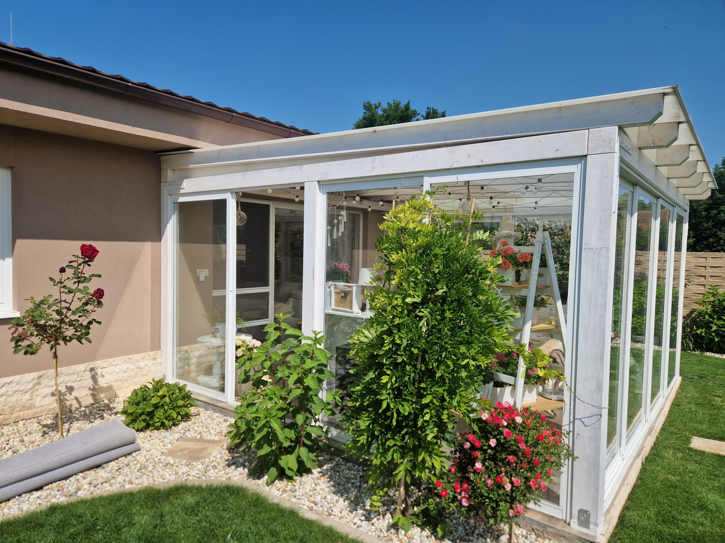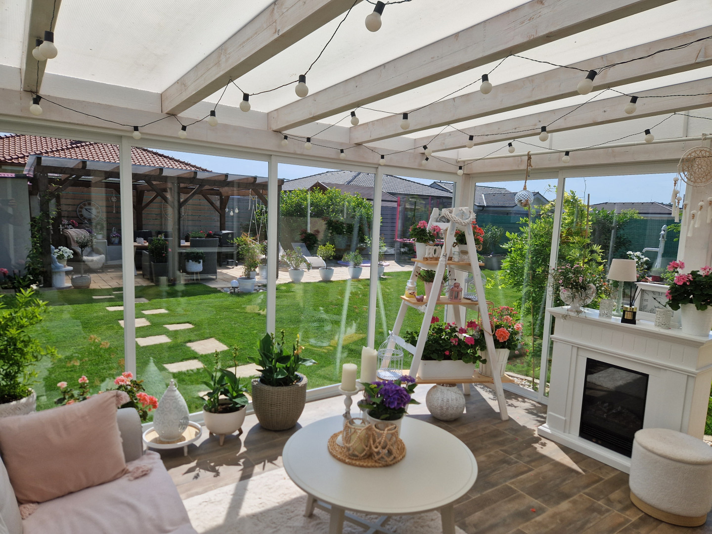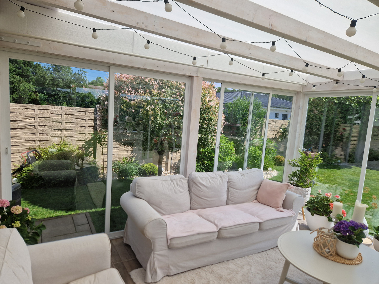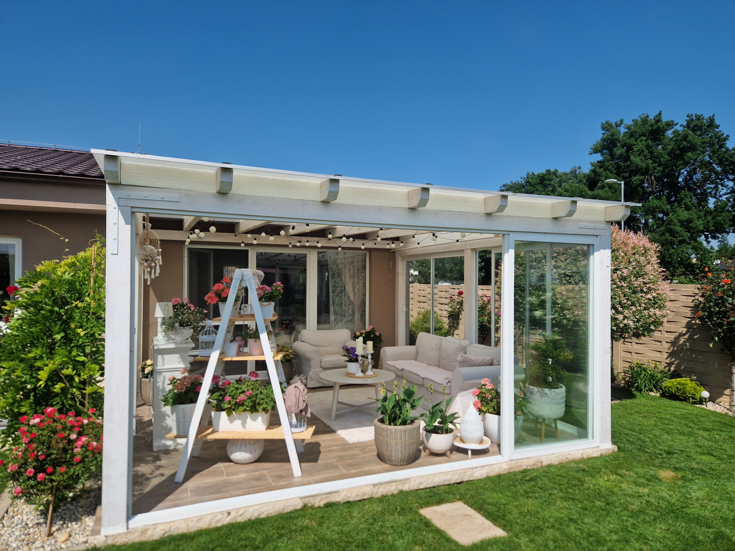 À Brno, nous avons transformé une terrasse en une magnifique véranda, où les propriétaires peuvent profiter d'un confort absolu tout au long de l'année. Sa structure robuste en aluminium, ses grands panneaux de verre et son atmosphère chaleureuse créent l'espace de détente idéal avec vue sur le jardin, même lorsqu'il pleut ou qu'il neige à l'extérieur.