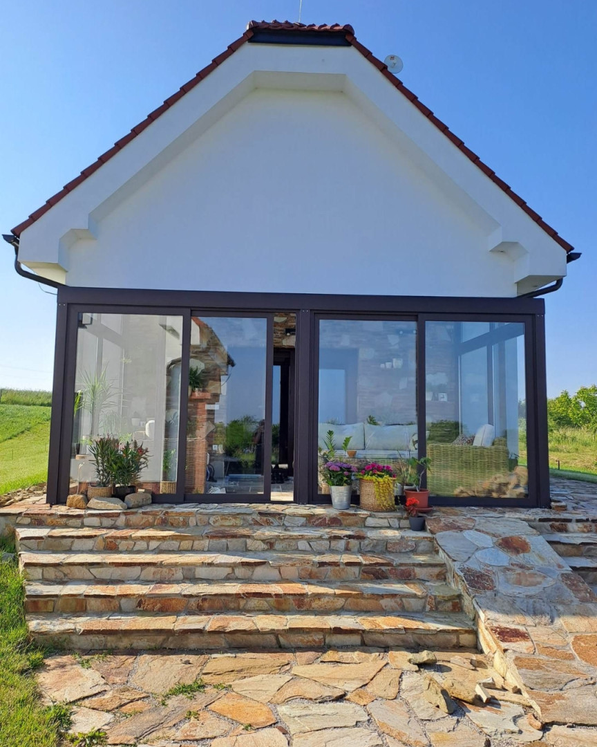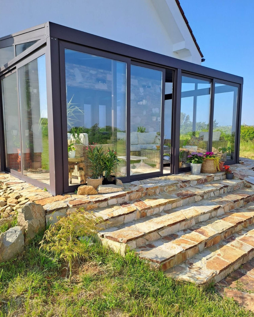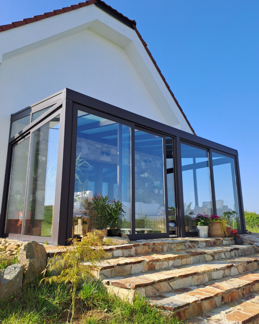 La véranda de type ROBUST agrandit votre maison d'un espace solide et pratique, utilisable tout au long de l'année. Qu'il s'agisse d'un salon couvert, d'une salle à manger, d'un coin bureau ou d'un espace de détente, elle vous offre un confort optimal, même par mauvais temps.