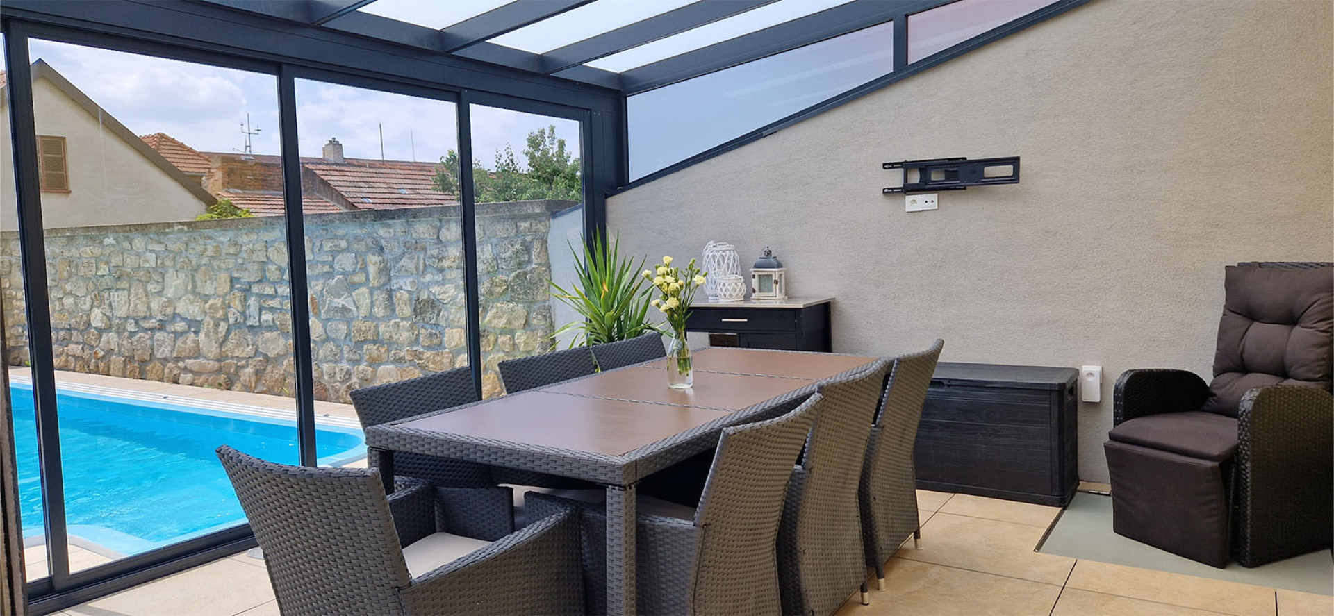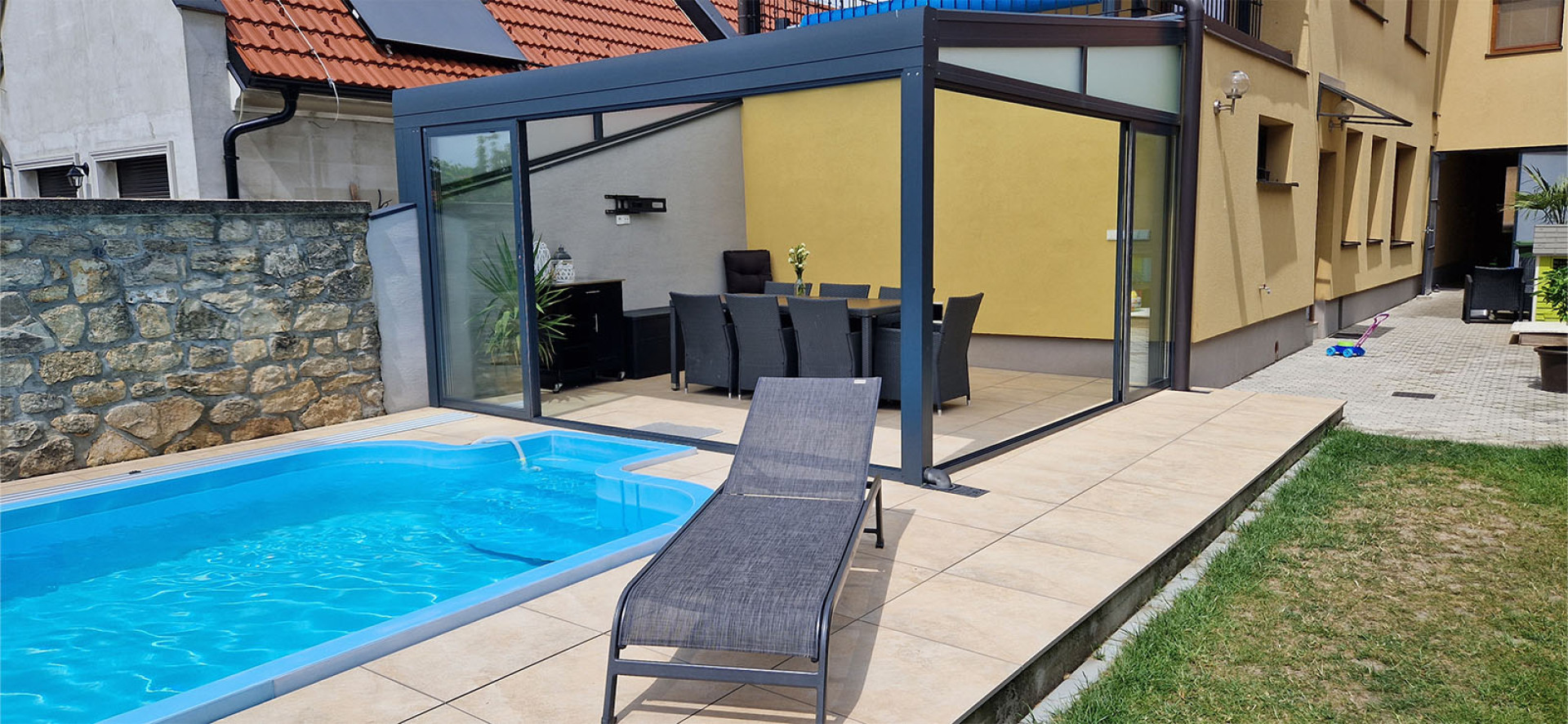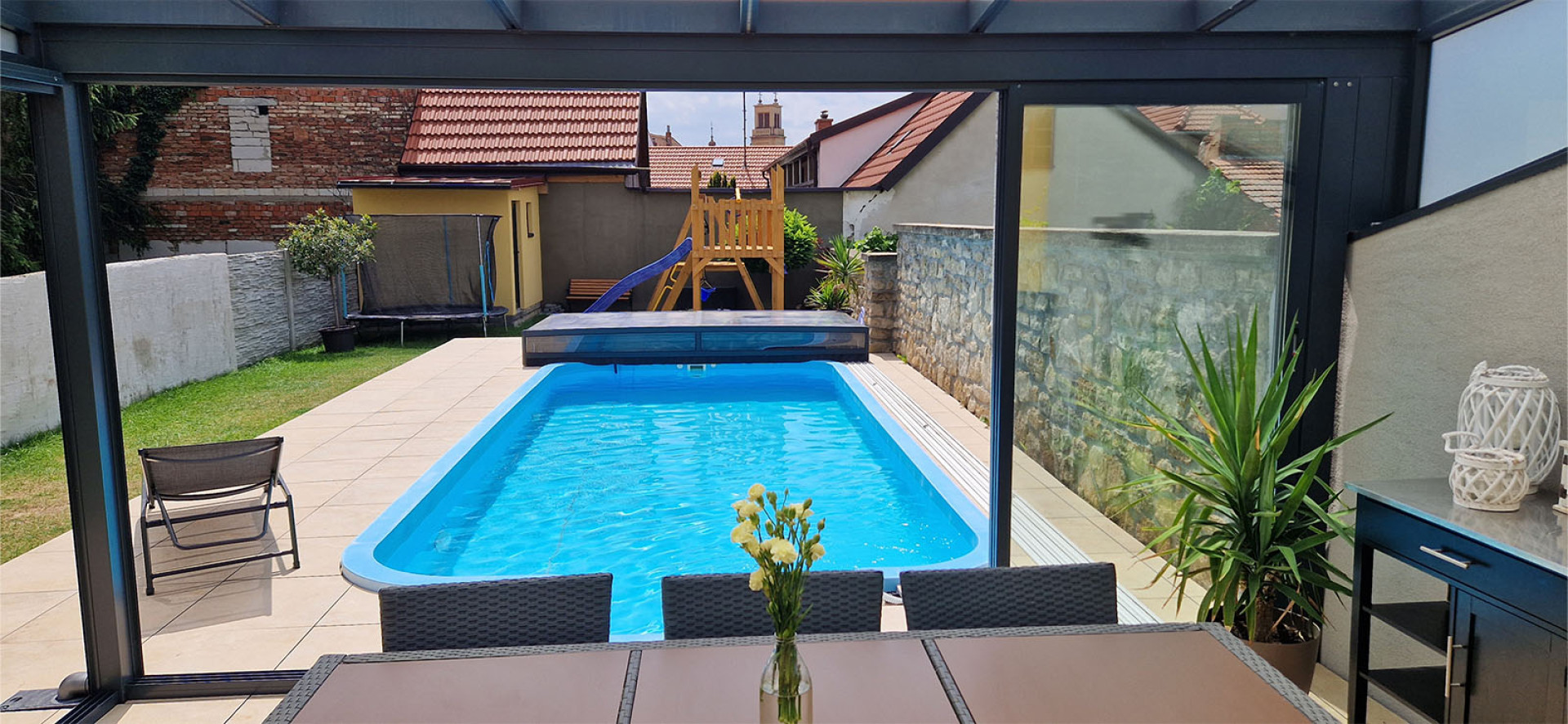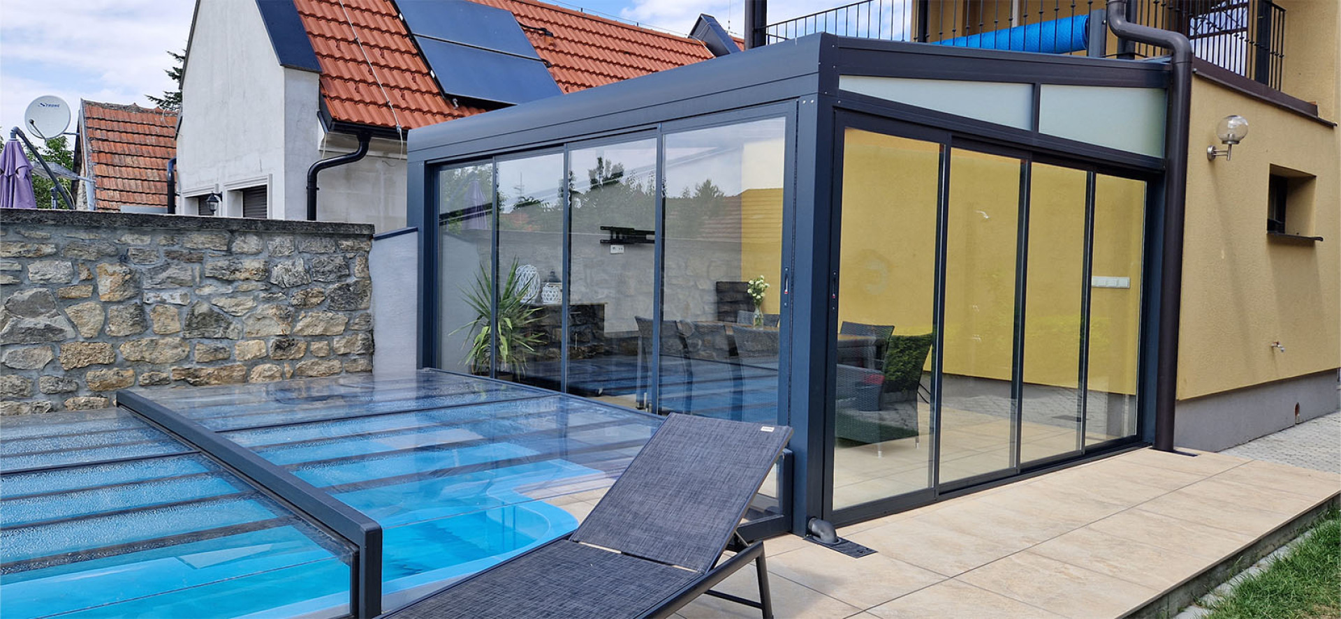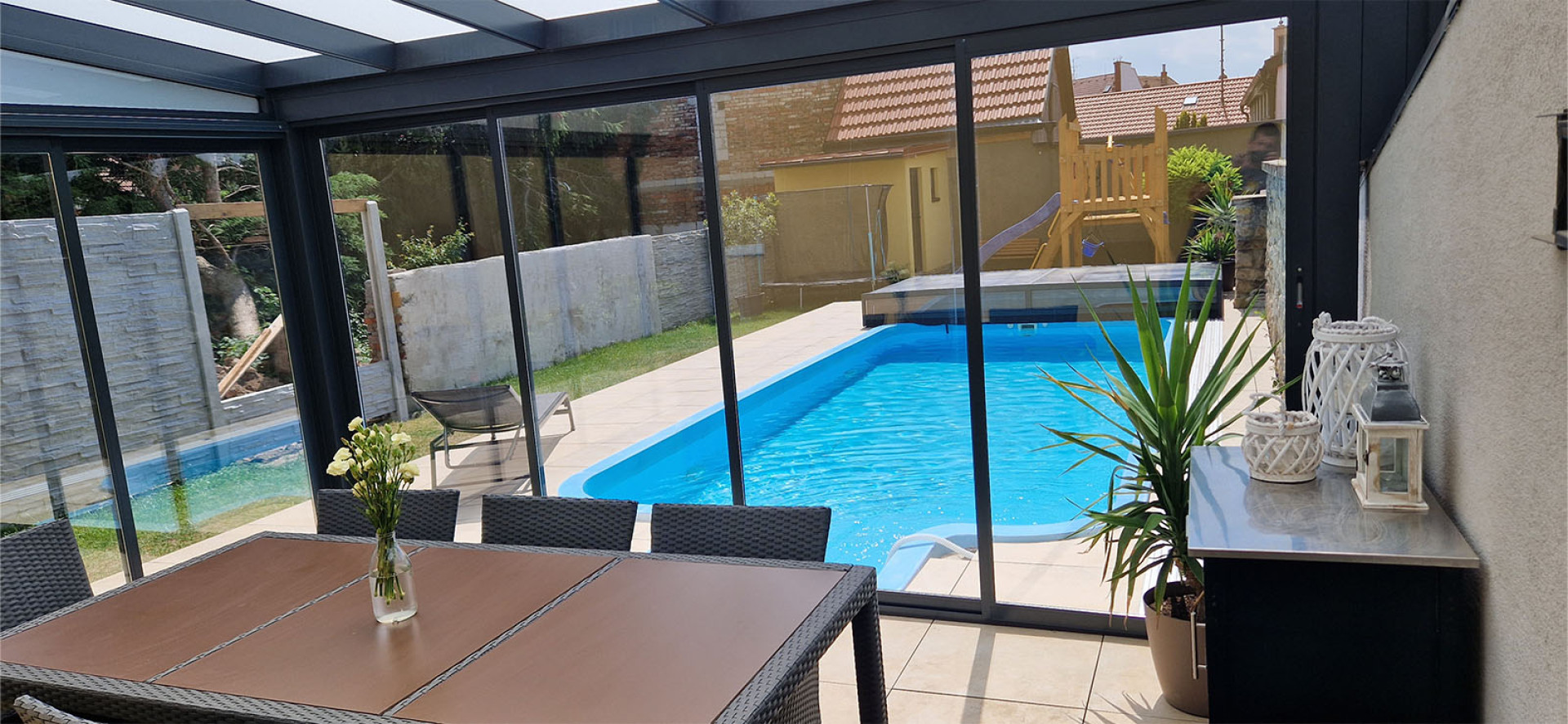 À Skalica, nous avons réalisé une véranda de type ROBUST avec une structure fixe en aluminium, qui agrandit naturellement l'espace de vie tout en offrant un confort optimal au bord de la piscine. L'installation comprend également l'abri de piscine EXCLUSIVE, créant ainsi un espace unique, visuellement et fonctionnellement unifié.