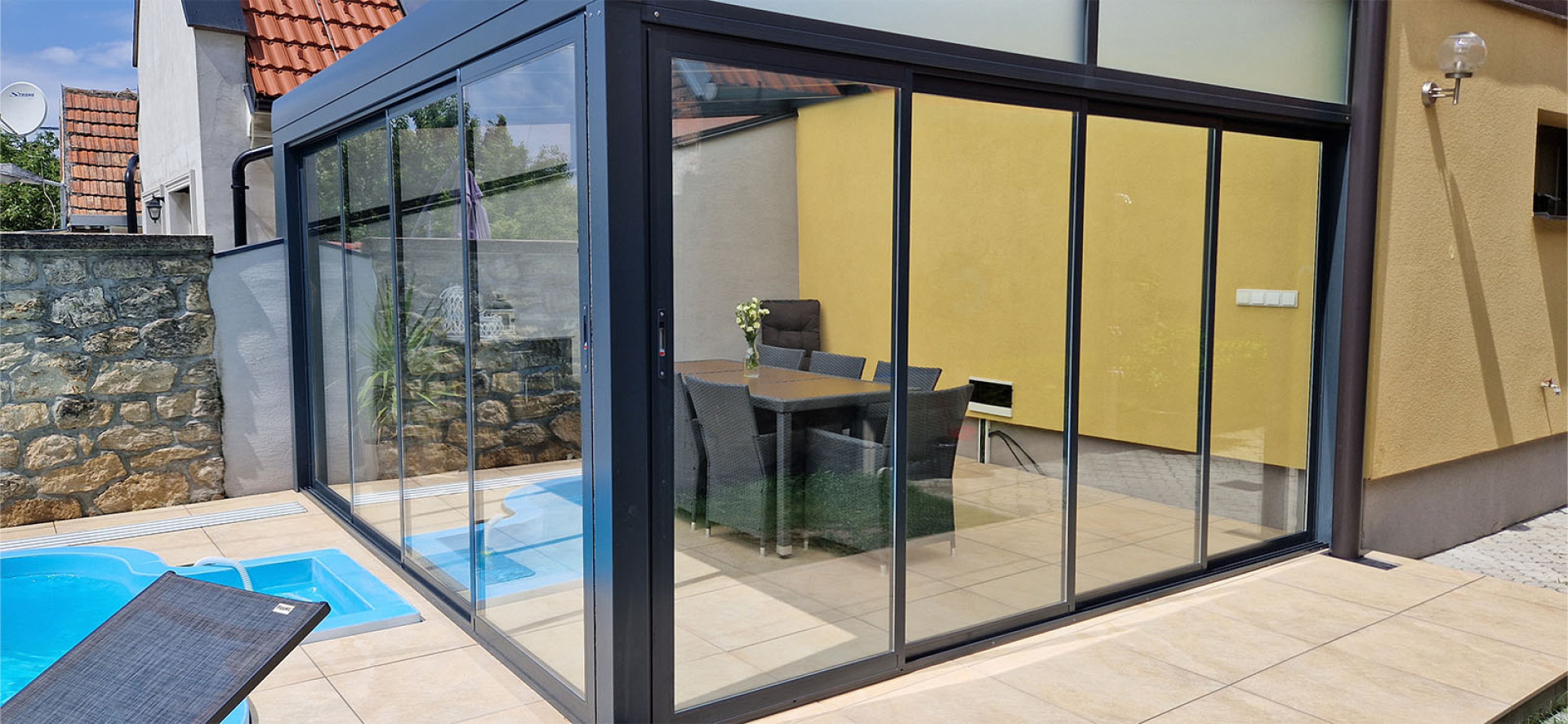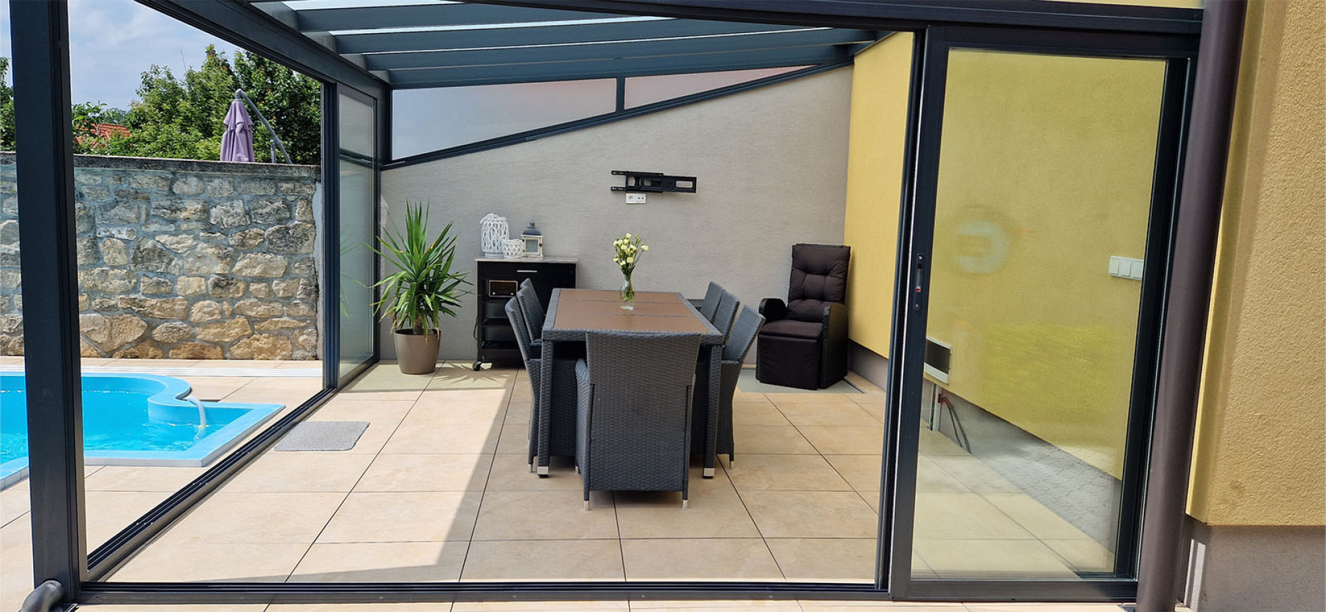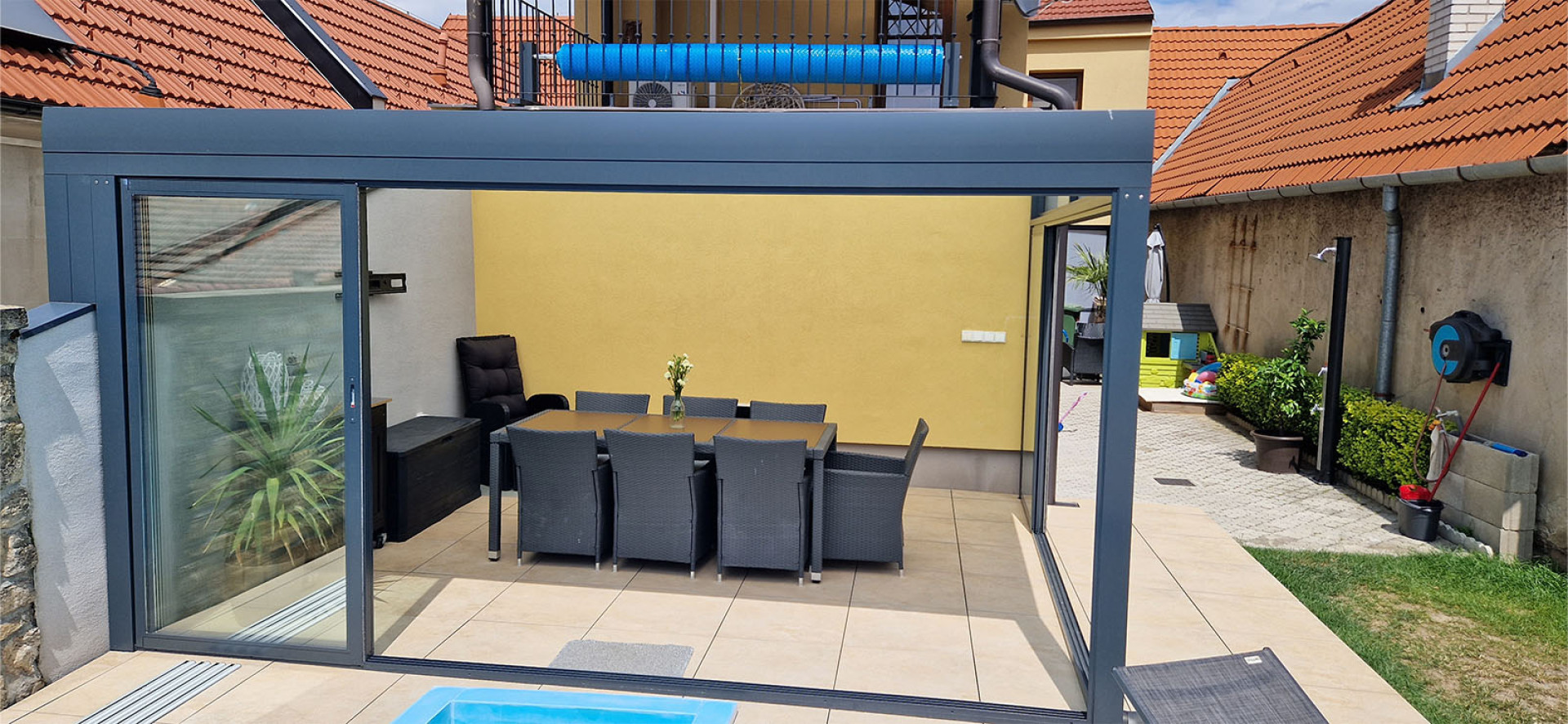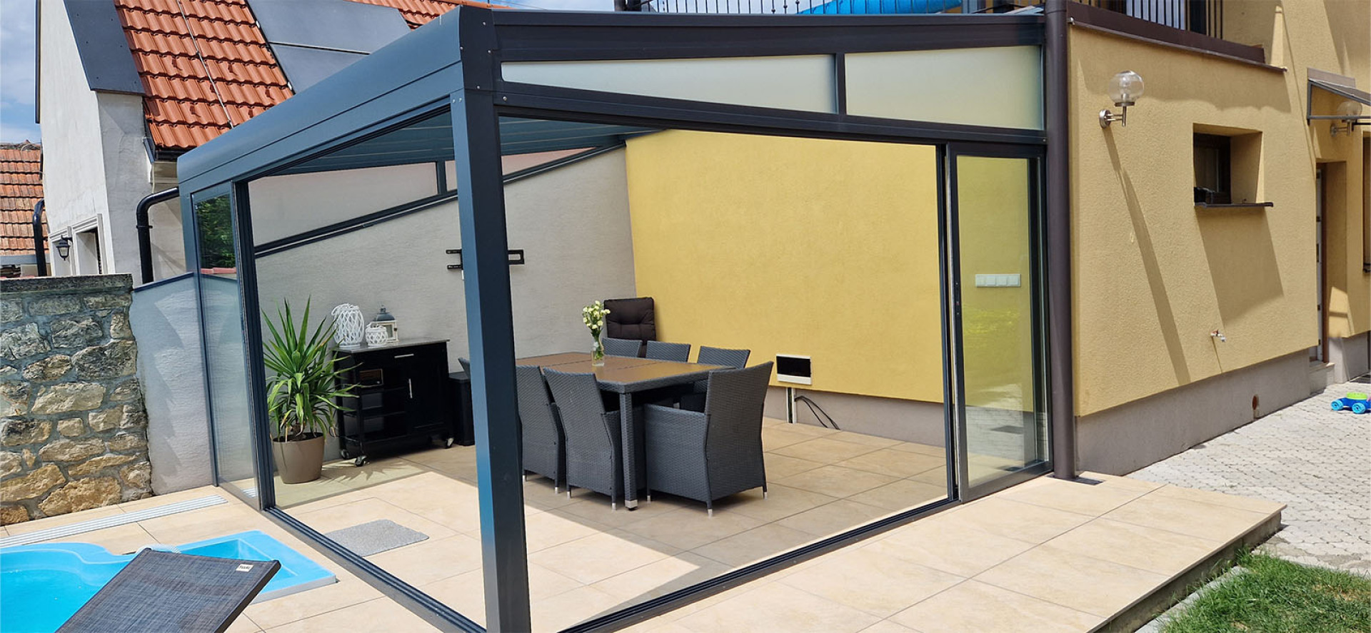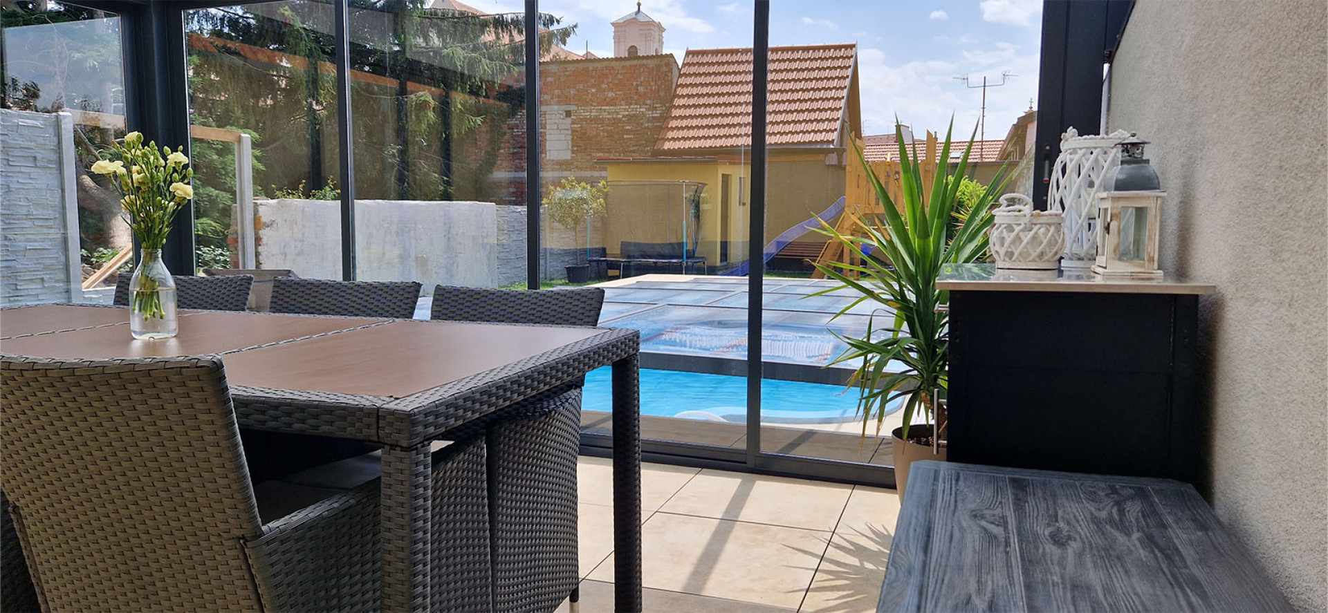 À Skalica, nous avons réalisé une véranda de type ROBUST avec une structure fixe en aluminium, qui agrandit naturellement l'espace de vie tout en offrant un confort optimal au bord de la piscine. L'installation comprend également l'abri de piscine EXCLUSIVE, créant ainsi un espace unique, visuellement et fonctionnellement unifié.
