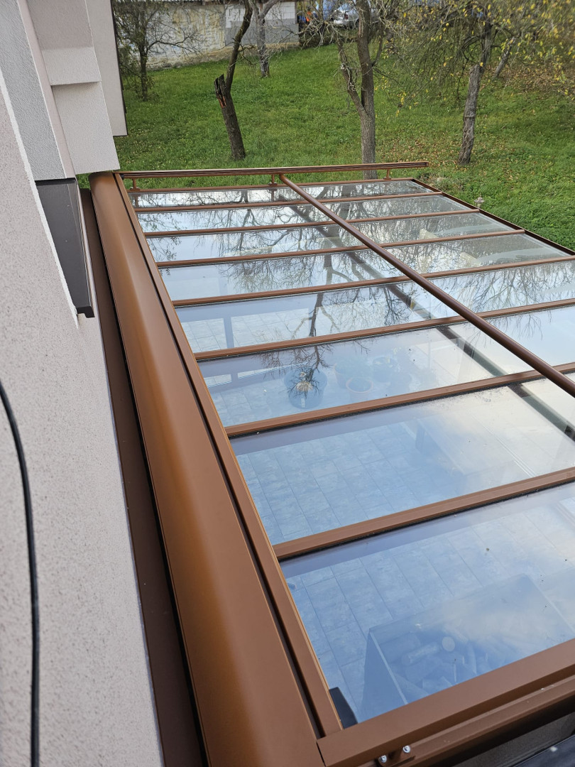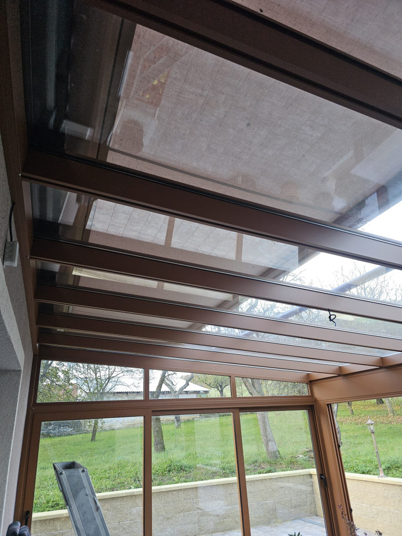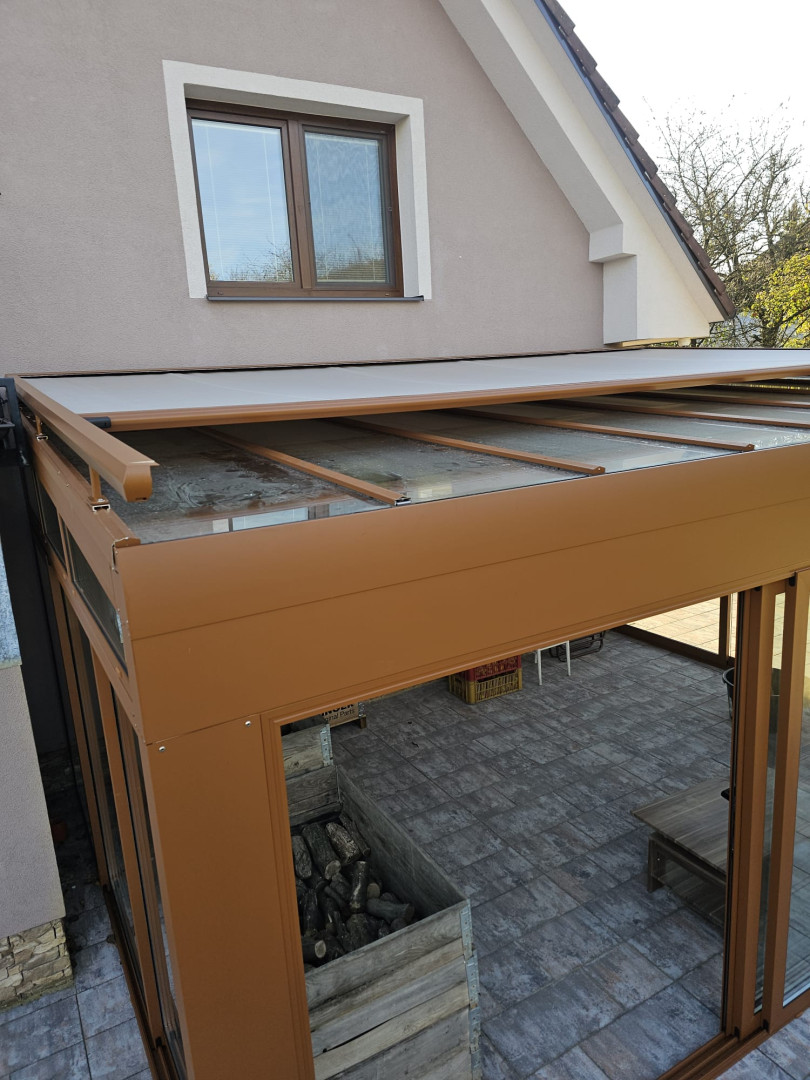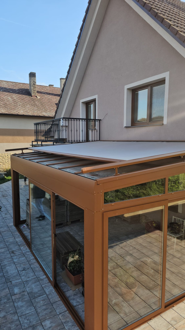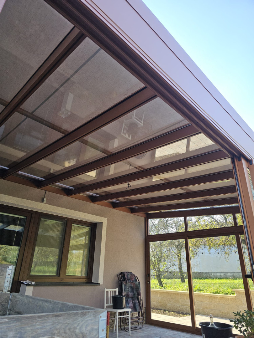 Dans cette réalisation, nous avons livré une véranda ROBUST équipée d'un double vitrage isolant clair de 24 mm, complétée par un renfort intégré permettant de supprimer le poteau central, ainsi qu'un store extérieur XLINE pratique pour l'ombrage en toiture.