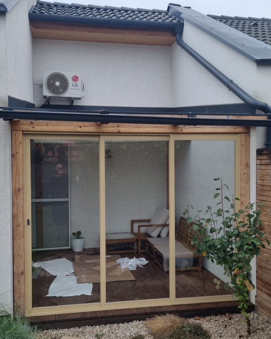 Grâce au vitrage avec système coulissant et à son cadre discret à l'aspect bois, un espace de détente idéal a été créé.