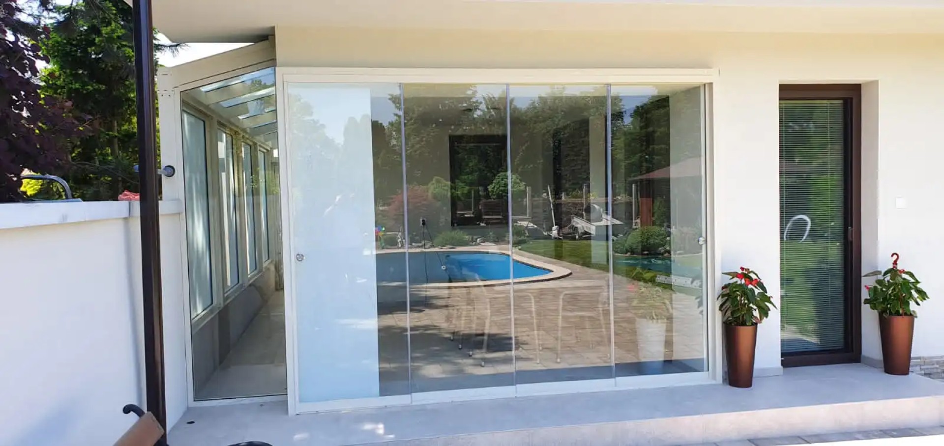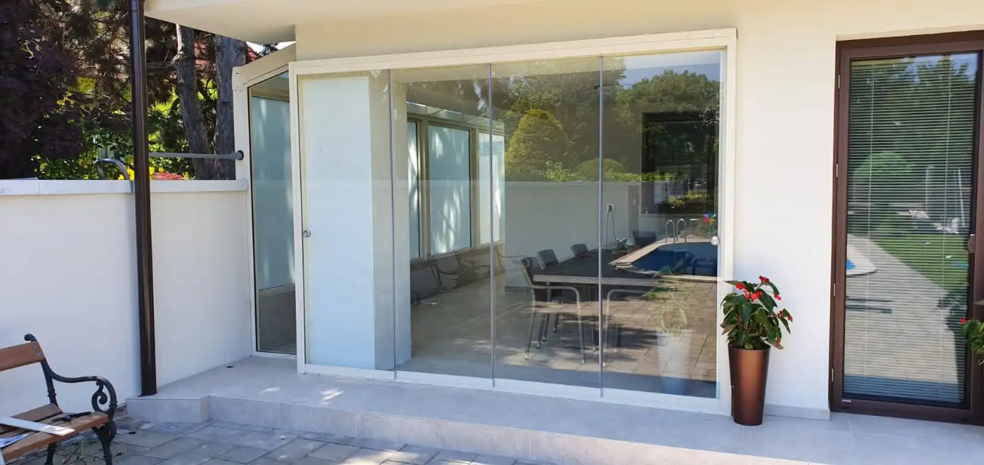 La famille de notre client souhaitait sublimer la vue sur le jardin lors de leurs repas partagés. Ils ont donc opté pour le vitrage sans cadre DELUX qui, grâce à ses lignes épurées, n'entrave pas la vue et peut s'ouvrir facilement grâce à son système de rails.